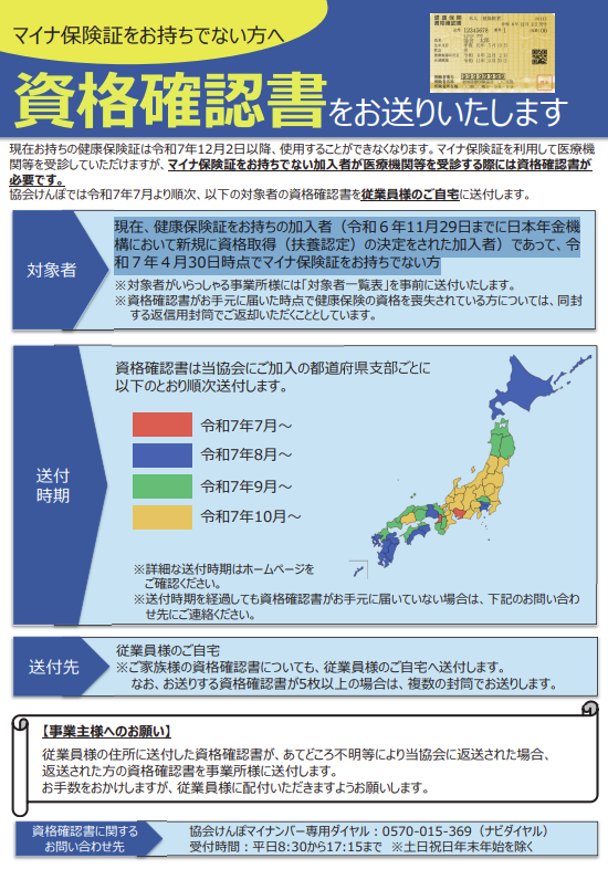 協会けんぽでは、令和7年7月より順次、対象となる従業員のご自宅へ送付を開始します。ご家族様の資格確認書も、従業員様のご自宅へまとめて送られます。もし送付される資格確認書が5枚以上の場合は、複数の封筒に分かれて届くことがあります。